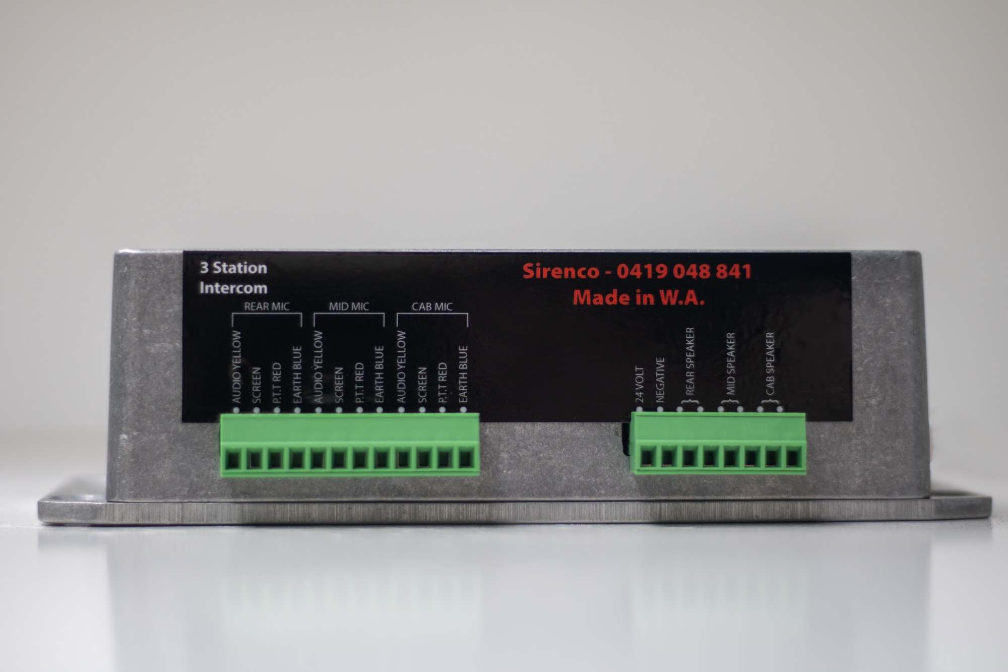 This unit is used primarily in WA, QLD, NSW and Tasmanian Police vehicles. It allows for listening to the rear cell area through front speaker as well as a microphone for talking to the rear cell. This unit also features a volume control for the officers in the front of the vehicle.